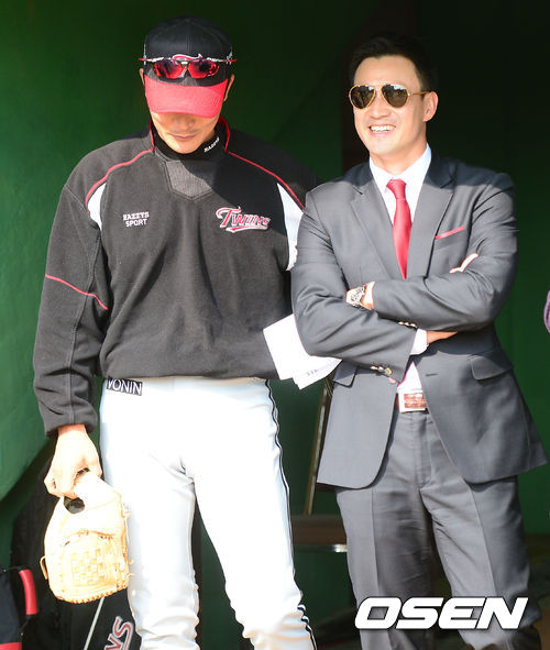 17일 오후 광주구장에서 열리는 '2013 한국야쿠르트 세븐 프로야구' KIA 타이거즈 대 LG 트윈스의 경기를 앞두고 김재현 해설과 LG 류택현이 인사를 나누고 있다.