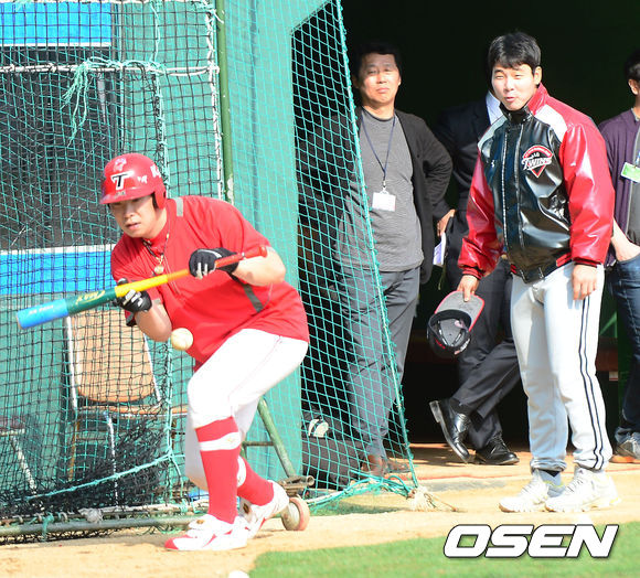 17일 오후 광주구장에서 열리는 '2013 한국야쿠르트 세븐 프로야구' KIA 타이거즈 대 LG 트윈스의 경기를 앞두고 KIA 나지완과 LG 현재윤이 대화를 나누고 있다.