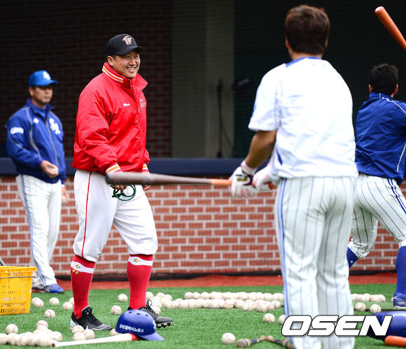 17일 오후 포항야구장에서 열린 2013 한국야쿠르트 세븐프로야구 삼성 라이온즈와 SK 와이번스의 경기, 경기에 앞서 SK 조인성이 훈련 중인 삼성 선수들과 인사를 나누고 있다.