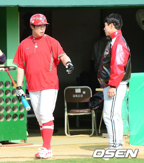17일 오후 광주구장에서 열리는 '2013 한국야쿠르트 세븐 프로야구' KIA 타이거즈 대 LG 트윈스의 경기를 앞두고 LG 현재윤과 KIA 나지완이 대화를 나누고 있다.