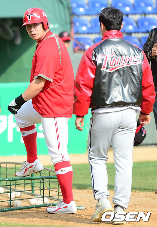 17일 오후 광주구장에서 열리는 '2013 한국야쿠르트 세븐 프로야구' KIA 타이거즈 대 LG 트윈스의 경기를 앞두고 KIA 나지완과 LG 현재윤이 대화를 나누고 있다.