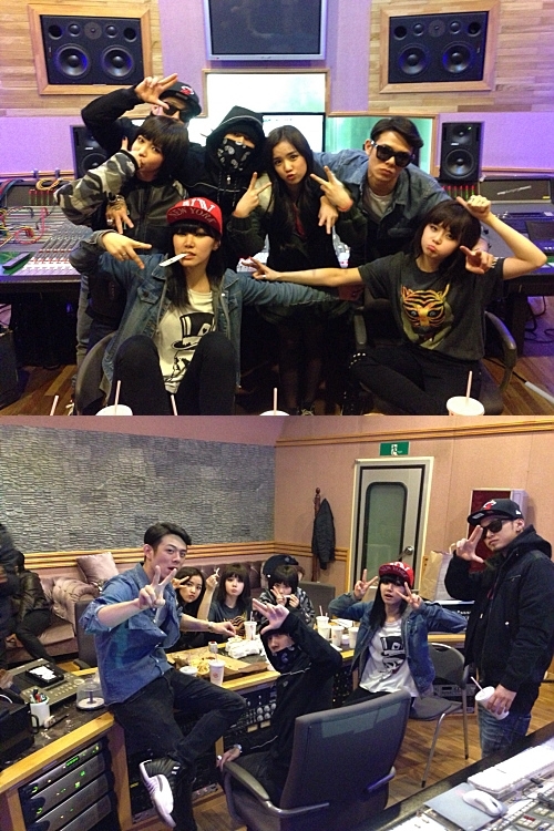 걸그룹 디유닛이 가수 도끼, 더 콰이엇, 빈지노와의 화기애애한 녹음실 사진을 공개했다.