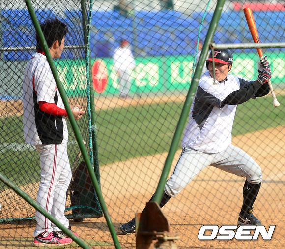17일 오후 광주구장에서 열리는 '2013 한국야쿠르트 세븐 프로야구' KIA 타이거즈 대 LG 트윈스의 경기를 앞두고 LG 이진영과 KIA 이용규가 대화를 나누고 있다.