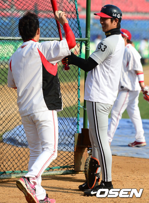 17일 오후 광주구장에서 열리는 '2013 한국야쿠르트 세븐 프로야구' KIA 타이거즈 대 LG 트윈스의 경기를 앞두고 KIA 이용규와 LG 이대형이 대화를 나누고 있다.