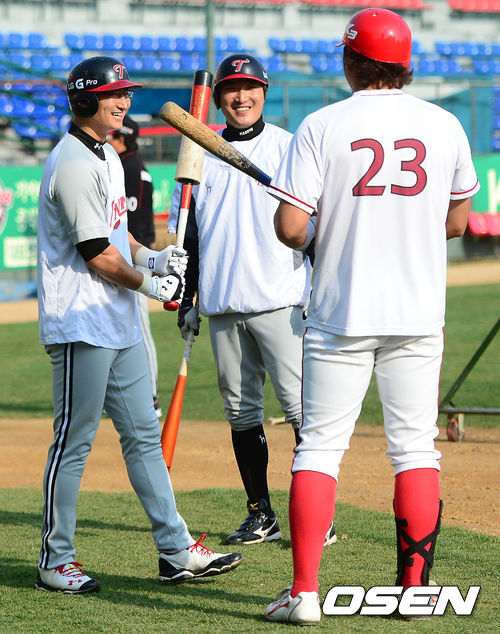 17일 오후 광주구장에서 열리는 '2013 한국야쿠르트 세븐 프로야구' KIA 타이거즈 대 LG 트윈스의 경기를 앞두고 LG 박용택, 이진영과 KIA 최희섭이 대화를 나누고 있다.