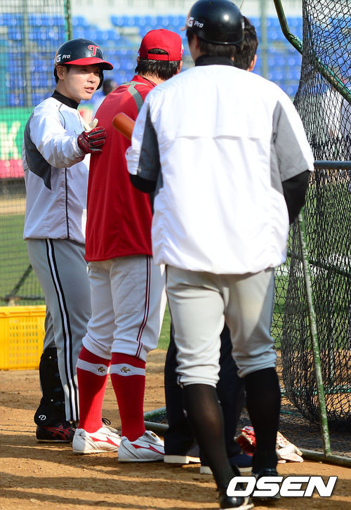 17일 오후 광주구장에서 열리는 '2013 한국야쿠르트 세븐 프로야구' KIA 타이거즈 대 LG 트윈스의 경기를 앞두고 LG 현재윤과 KIA 나지완이 대화를 나누고 있다.