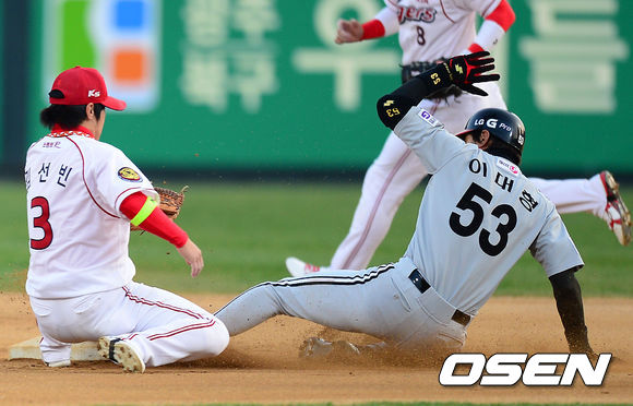17일 오후 광주구장에서 '2013 한국야쿠르트 세븐 프로야구' KIA 타이거즈 대 LG 트윈스의 경기가 열렸다. 1회초 LG 공격 1사 1루 상황 이대형이 2루 도루에 성공하고 있다.