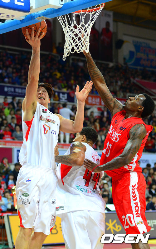 17일 오후 울산 동천체육관에서 열린 '2012-2013 KB국민카드 프로농구 챔피언결정 4차전 울산 모비스와 서울 SK의 경기, 1쿼터 SK 최부경이 레이업슛을 시도하고 있다