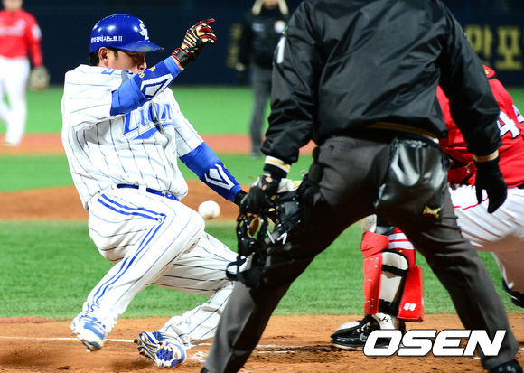 17일 오후 포항야구장에서 열린 2013 한국야쿠르트 세븐프로야구 삼성 라이온즈와 SK 와이번스의 경기, 2회말 2사 1,2루에서 삼성 배영섭의 우전 적시타 때 2루주자 진갑용이 홈으로 쇄도하고 있다.