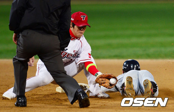 17일 오후 광주구장에서 '2013 한국야쿠르트 세븐 프로야구' KIA 타이거즈 대 LG 트윈스의 경기가 열렸다. 2회초 LG 공격 2사 1루 상황 주자 오지환이 2루 도루에 성공하고 있다. KIA 2루수는 김선빈.