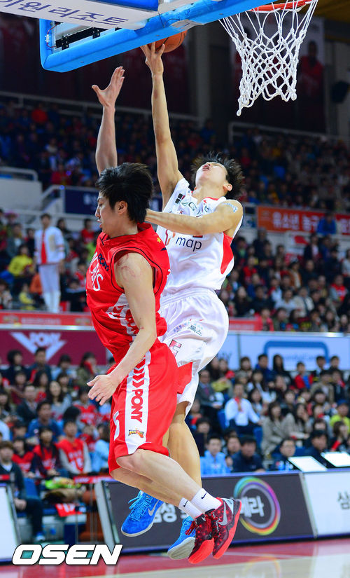 17일 오후 울산 동천체육관에서 열린 '2012-2013 KB국민카드 프로농구 챔피언결정 4차전 울산 모비스와 서울 SK의 경기, 2쿼터 SK 김선형이 모비스 김시래의 수비를 피해 레이업슛을 성공하고 있다