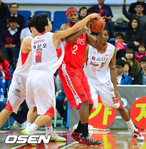 17일 오후 울산 동천체육관에서 열린 '2012-2013 KB국민카드 프로농구 챔피언결정 4차전 울산 모비스와 서울 SK의 경기, 2쿼터 모비스 벤슨이 SK 수비를 상대로 몸싸움을 펼치고 있다