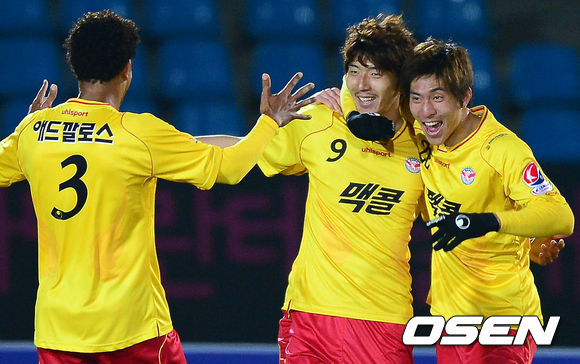 17일 오후 성남 탄천종합운동장에서 열린 '현대오일뱅크 K리그 클래식' 성남 일화와 FC 서울의 경기 전반 성남 김동섭이 선제골을 넣고 애드깔로스와 기뻐하고 있다.