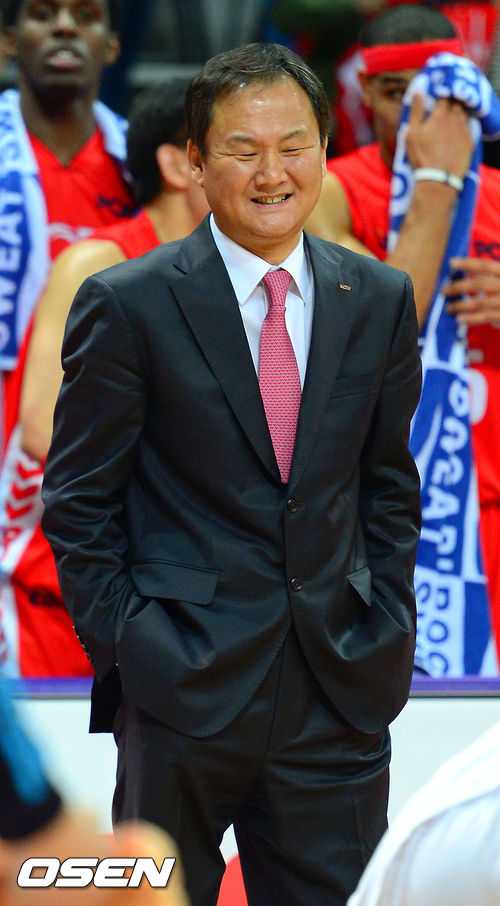 17일 오후 울산 동천체육관에서 열린 '2012-2013 KB국민카드 프로농구 챔피언결정 4차전 울산 모비스와 서울 SK의 경기, 2쿼터 모비스 유재학 감독이 미소 짓고 있다