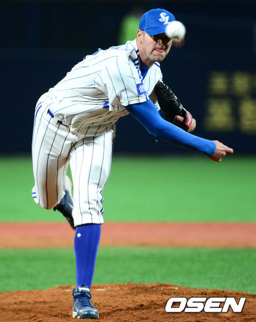 17일 오후 포항야구장에서 열린 2013 한국야쿠르트 세븐프로야구 삼성 라이온즈와 SK 와이번스의 경기, 1회초 삼성 선발 투수 밴덴헐크가 힘차게 공을 던지고 있다.