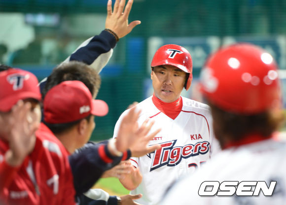 17일 오후 광주구장에서 '2013 한국야쿠르트 세븐 프로야구' KIA 타이거즈 대 LG 트윈스의 경기가 열렸다. 3회말 KIA 공격 무사 2, 3루 상황 5번 최희섭의 희생플라이때 득점에 성공한 이범호가 동료들과 인사를 나누고 있다.