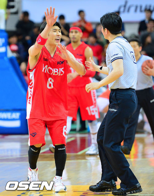 17일 오후 울산 동천체육관에서 열린 '2012-2013 KB국민카드 프로농구 챔피언결정 4차전 울산 모비스와 서울 SK의 경기, 2쿼터 종료 후 모비스 양동근이 심판에게 어필하고 있다