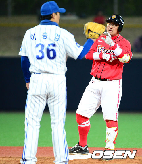 17일 오후 포항야구장에서 열린 2013 한국야쿠르트 세븐프로야구 삼성 라이온즈와 SK 와이번스의 경기, 4회초 1사 1루에서 SK 조인성이 우전 동점 적시타를 치고 타임을 외치고 있다.