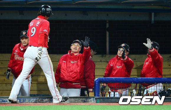 17일 오후 포항야구장에서 열린 2013 한국야쿠르트 세븐프로야구 삼성 라이온즈와 SK 와이번스의 경기, 4회초 1사 1루에서 SK 조인성의 우전 동점 적시타 때 홈을 밟은 1루주자 임훈이 덕아웃에서 동료들의 축하를 받고 있다.