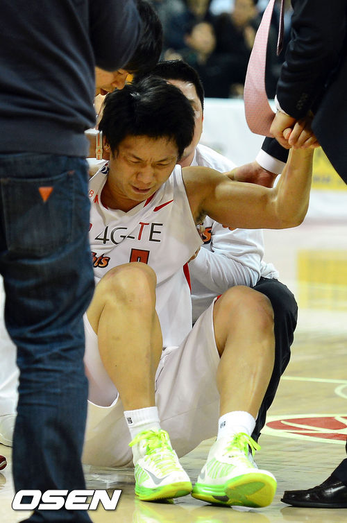 17일 오후 울산 동천체육관에서 열린 '2012-2013 KB국민카드 프로농구 챔피언결정 4차전 울산 모비스와 서울 SK의 경기, 3쿼터 부상을 당한 SK 박상오가 부축을 받으며 일어나고 있다.