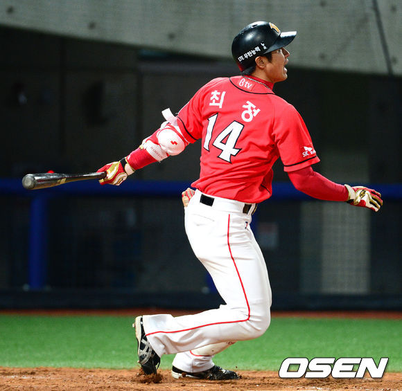 17일 오후 포항야구장에서 열린 2013 한국야쿠르트 세븐프로야구 삼성 라이온즈와 SK 와이번스의 경기, 3회초 2사 3루에서 SK 최정이 적시타를 치고 있다.
