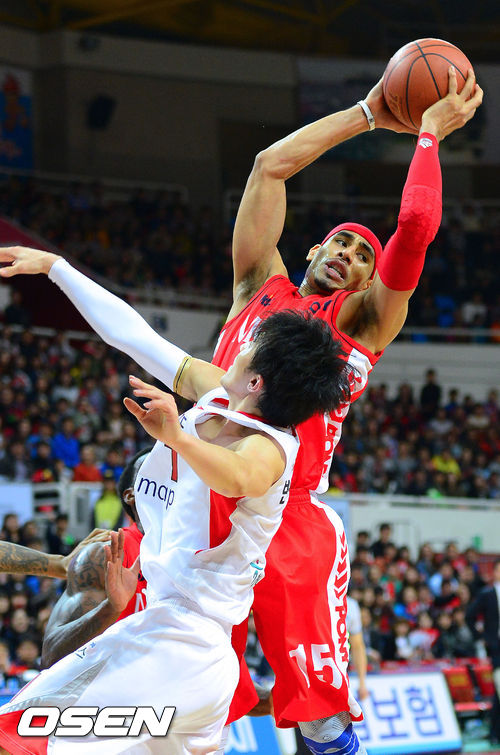 17일 오후 울산 동천체육관에서 열린 '2012-2013 KB국민카드 프로농구 챔피언결정 4차전 울산 모비스와 서울 SK의 경기, 3쿼터 모비스 문태영이 리바운드 성공하고 있다