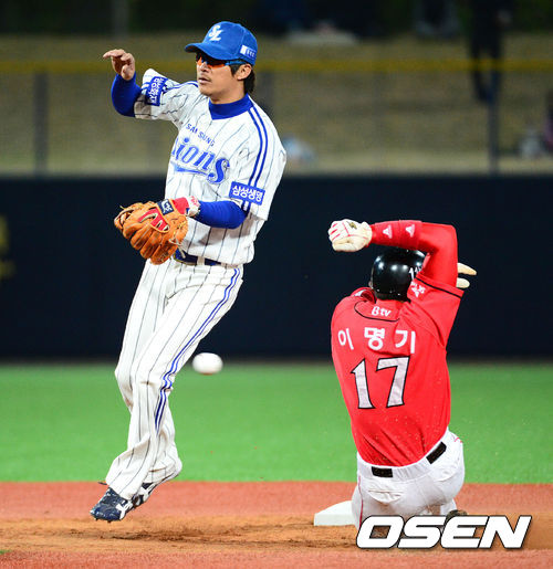 17일 오후 포항야구장에서 열린 2013 한국야쿠르트 세븐프로야구 삼성 라이온즈와 SK 와이번스의 경기, 3회초 2사 1루에서 SK 최정 타석 때 1루주자 이명기가 도루에 성공하고 있다.