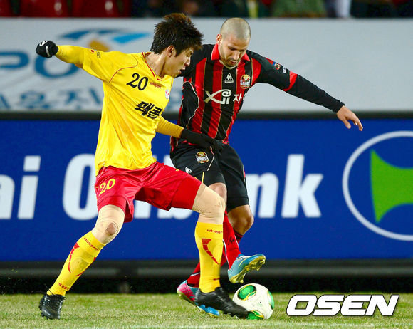 17일 오후 성남 탄천종합운동장에서 열린 '현대오일뱅크 K리그 클래식' 성남 일화와 FC 서울의 경기 전반 FC 서울 에스쿠데로와 성남 윤영선이 볼다툼을 하고 있다.