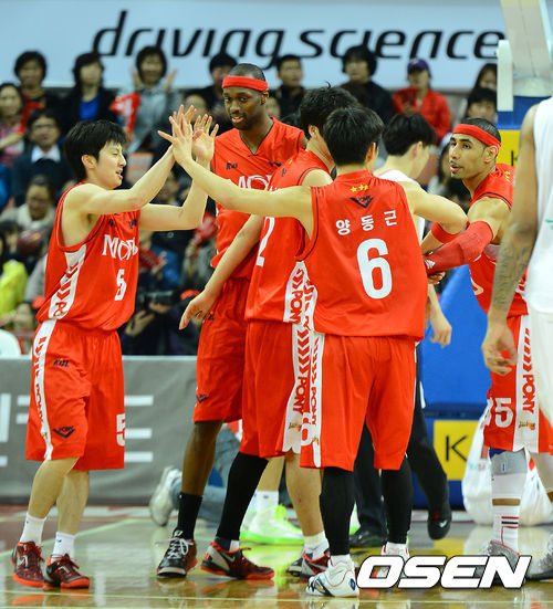 17일 오후 울산 동천체육관에서 열린 '2012-2013 KB국민카드 프로농구 챔피언결정 4차전 울산 모비스와 서울 SK의 경기, 4쿼터 득점에 성공한 모비스 선수들이 서로를 격려하고 있다.