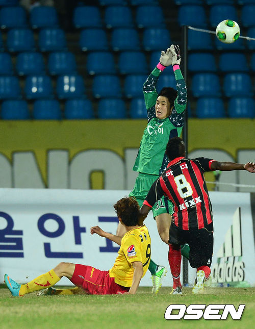 17일 오후 성남 탄천종합운동장에서 열린 '현대오일뱅크 K리그 클래식' 성남 일화와 FC 서울의 경기 후반 성남 김동섭이 FC 서울 유상훈의 키를 넘겨 추가골을 넣고 있다.