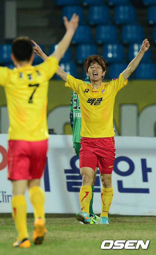 17일 오후 성남 탄천종합운동장에서 열린 '현대오일뱅크 K리그 클래식' 성남 일화와 FC 서울의 경기 후반 성남 김동섭이 FC 서울 유상훈의 키를 넘겨 추가골을 넣고 기뻐하고 있다.