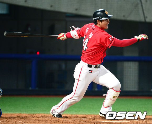 17일 오후 포항야구장에서 열린 2013 한국야쿠르트 세븐프로야구 삼성 라이온즈와 SK 와이번스의 경기, 7회초 1사 2루에서 SK 최정의 좌전안타를 치고 있다.