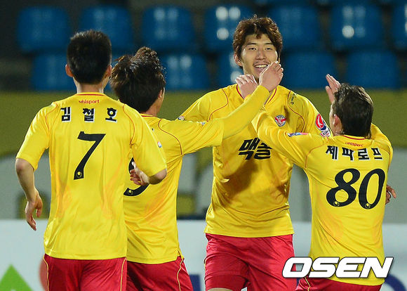 17일 오후 성남 탄천종합운동장에서 열린 '현대오일뱅크 K리그 클래식' 성남 일화와 FC 서울의 경기 후반 성남 김동섭이 FC 서울 유상훈의 키를 넘겨 추가골을 넣고 동료들과 기뻐하고 있다.