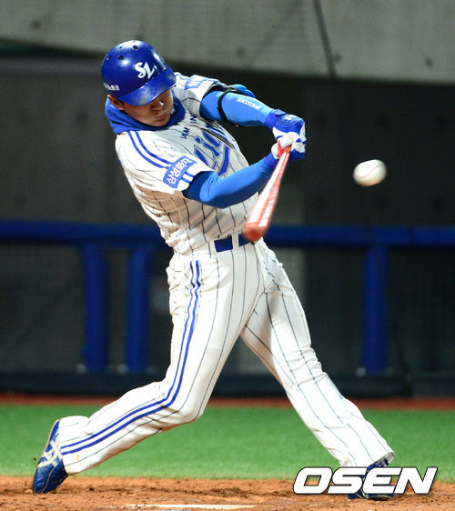 17일 오후 포항야구장에서 열린 2013 한국야쿠르트 세븐프로야구 삼성 라이온즈와 SK 와이번스의 경기, 7회말 1사 2,3루에서 삼성 배영섭이 우전 적시타를 치고 있다.