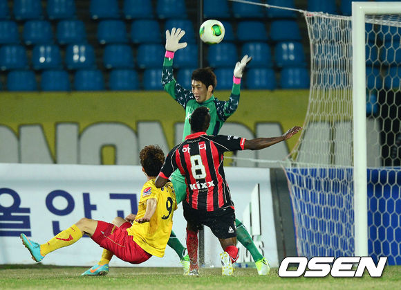 17일 오후 성남 탄천종합운동장에서 열린 '현대오일뱅크 K리그 클래식' 성남 일화와 FC 서울의 경기 후반 성남 김동섭이 FC 서울 유상훈의 키를 넘겨 추가골을 넣고 있다.