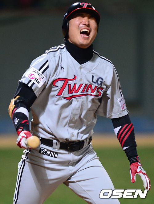 17일 오후 광주구장에서 '2013 한국야쿠르트 세븐 프로야구' KIA 타이거즈 대 LG 트윈스의 경기가 열렸다. 7회초 LG 공격 1사 2루 상황에서 5번 이진영이 좌익수 플라이를 날리고 아쉬워 하고 있다.