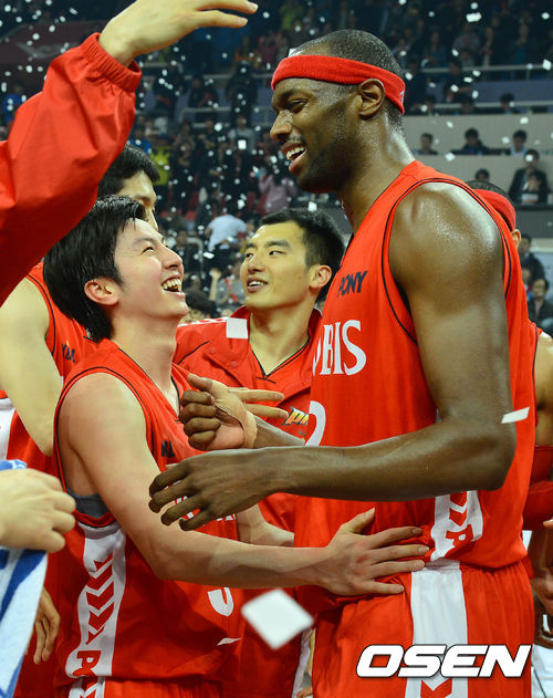 우승 후 모비스 김시래와 벤슨이 미소짓고 있다. /ouxou@osen.co.kr