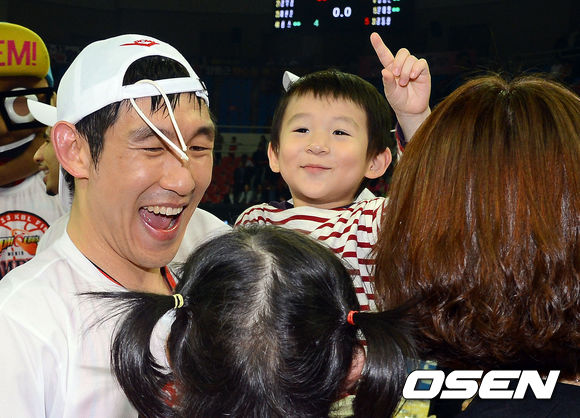 우승 후 모비스 양동근이 가족들과 미소짓고 있다./ouxou@osen.co.kr