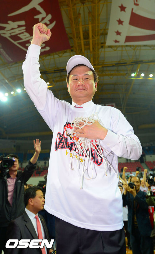 우승 후 모비스 유재학 감독이 림 줄을 자른 후 환호하고 있다. /soul1014@osen.co.kr