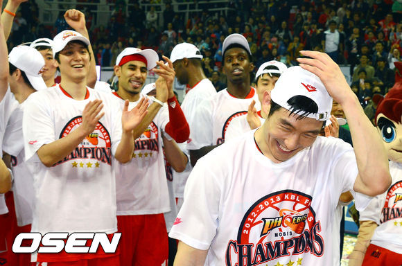 우승 후 mvp로 선정된 모비스 양동근이 동료들의 축하를 받으며 미소짓고 있다. /ouxou@osen.co.kr