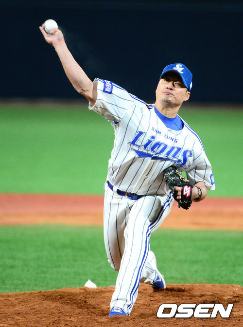17일 오후 포항야구장에서 열린 2013 한국야쿠르트 세븐프로야구 삼성 라이온즈와 SK 와이번스의 경기, 8회초 2사 3루에서 SK 박진만 타석 때 삼성 오승환이 힘차게 공을 던지고 있다.