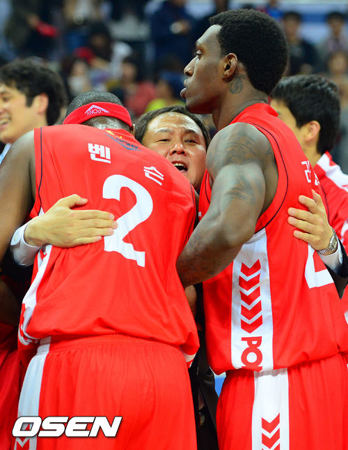 우승 후 모비스 유재학 감독이 벤슨, 라틀리프와 포옹을 하고 있다/soul1014@osen.co.kr
