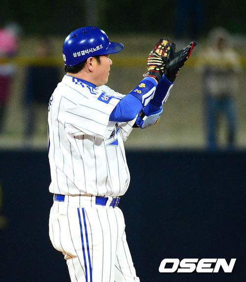 17일 오후 포항야구장에서 열린 2013 한국야쿠르트 세븐프로야구 삼성 라이온즈와 SK 와이번스의 경기, 8회말 1사 1,2루에서 삼성 진갑용이 좌전 2타점 적시타를 치고 환호하고 있다.