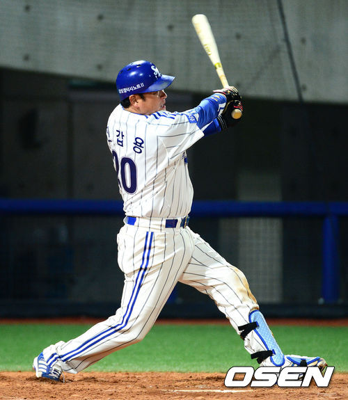 17일 오후 포항야구장에서 열린 2013 한국야쿠르트 세븐프로야구 삼성 라이온즈와 SK 와이번스의 경기, 8회말 1사 1,2루에서 삼성 진갑용이 좌전 2타점 적시타를 치고 있다.