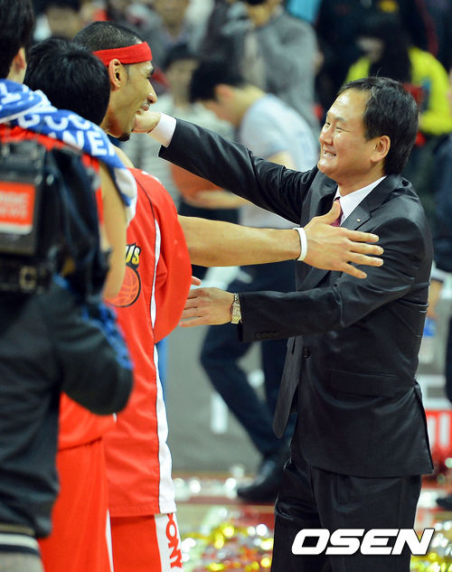 경기후 모비스 문태영과 유재학 감독이 포옹을 나누고 있다. /ouxou@osen.co.kr