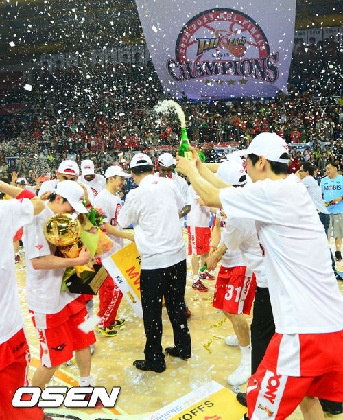 우승 후 모비스 선수들이 샴페인을 터트리며 기쁨을 나누고 있다. /soul1014@osen.co.kr