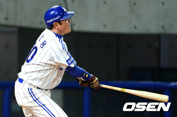 17일 오후 포항야구장에서 열린 2013 한국야쿠르트 세븐프로야구 삼성 라이온즈와 SK 와이번스의 경기, 8회말 1사 1,2루에서 삼성 진갑용이 좌전 2타점 적시타를 치고 있다.