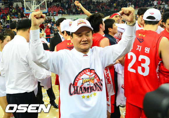 우승 후 모비스 유재학 감독이 두 팔을 번쩍 들며 포즈를 취하고 있다. /soul1014@osen.co.kr