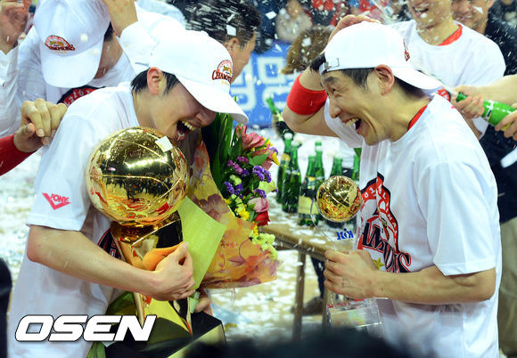 경기후 우승한 모비스 김시래 양동근이 미소짓고 있다. /ouxou@osen.co.kr