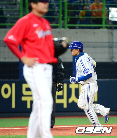 17일 오후 포항야구장에서 열린 2013 한국야쿠르트 세븐프로야구 삼성 라이온즈와 SK 와이번스의 경기, 8회말 2사 1,2루에서 삼성 이승엽이 우월 스리런 홈런을 치고 그라운드를 돌고 있다.